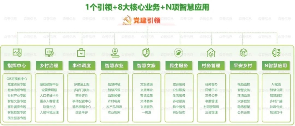 在党建引领的基础上,8大核心业务板块如同8根坚实的支柱,支撑起数字乡村建设的方方面面。